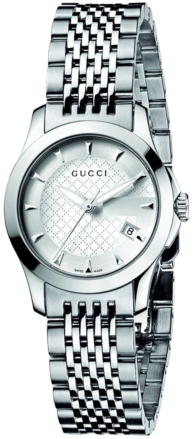 - Silver diamond-pattern dial with sun-brushed G frame